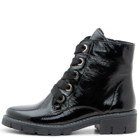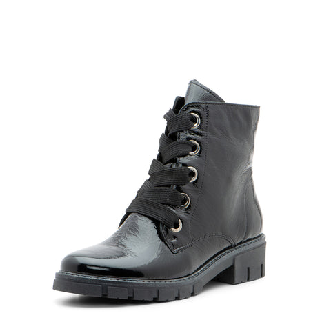 The Debbie lug sole zip boot in black crinkle leather updates a classic lace-up with sleek tailoring, polished grommets, luxe leather, side zip entry, and ara’s HighSoft comfort with removable padded insole.